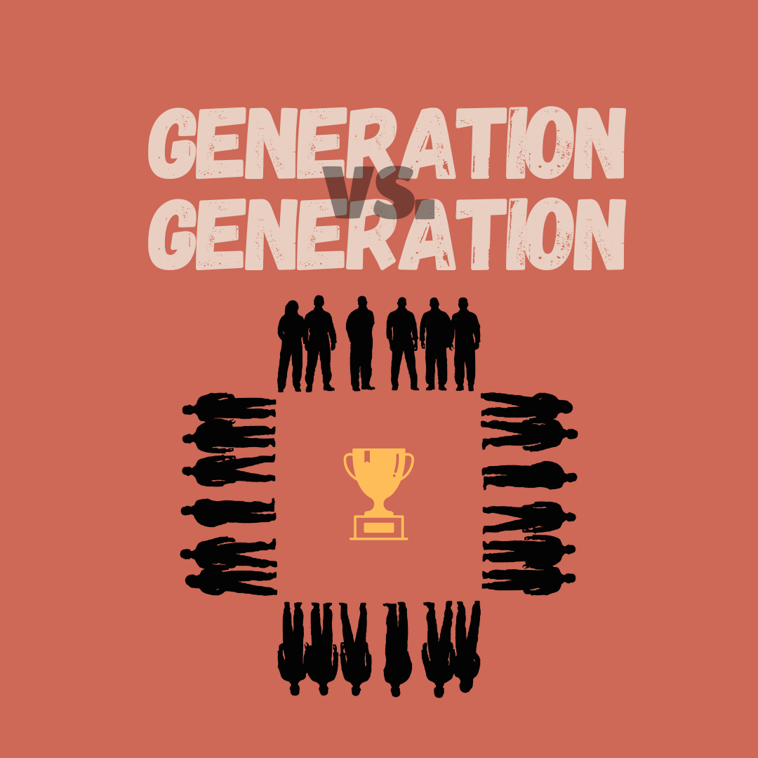The six living generations are facing each other in a field. The goal is the same for each generation - get to the middle and claim the throne of "greatest generation" (with all due respect to the actual Greatest Generation). Oddly enough, each generation has the same battle plan of standing against each other and firing insults about the different generations' way of life. When a generation's front line falls, they immediately replenish with more people but don't change the battle plan. Thus, no generation can move forward an inch because as soon as one generation finally dies off, the same battle plan is implemented to the next generation rising up.